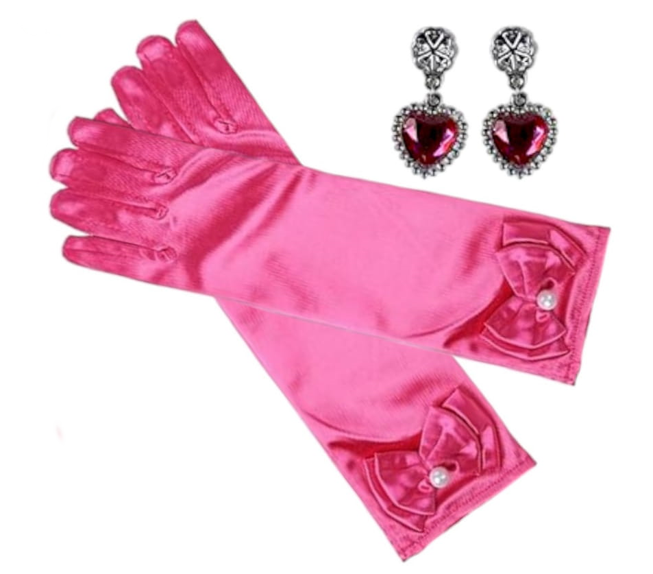 - rękawiczki: różowe rękawiczki z rozciągliwego materiału-rozmiar dziecięcy. Długość całkowita rękawiczki około 24 cm.