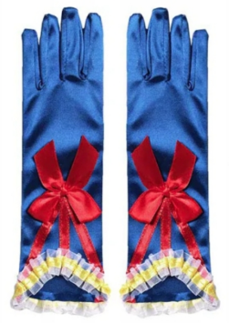 - rękawiczki: niebieskie rękawiczki bogato zdobione, z rozciągliwego materiału-rozmiar dziecięcy. Długość całkowita rękawiczki około 24 cm.