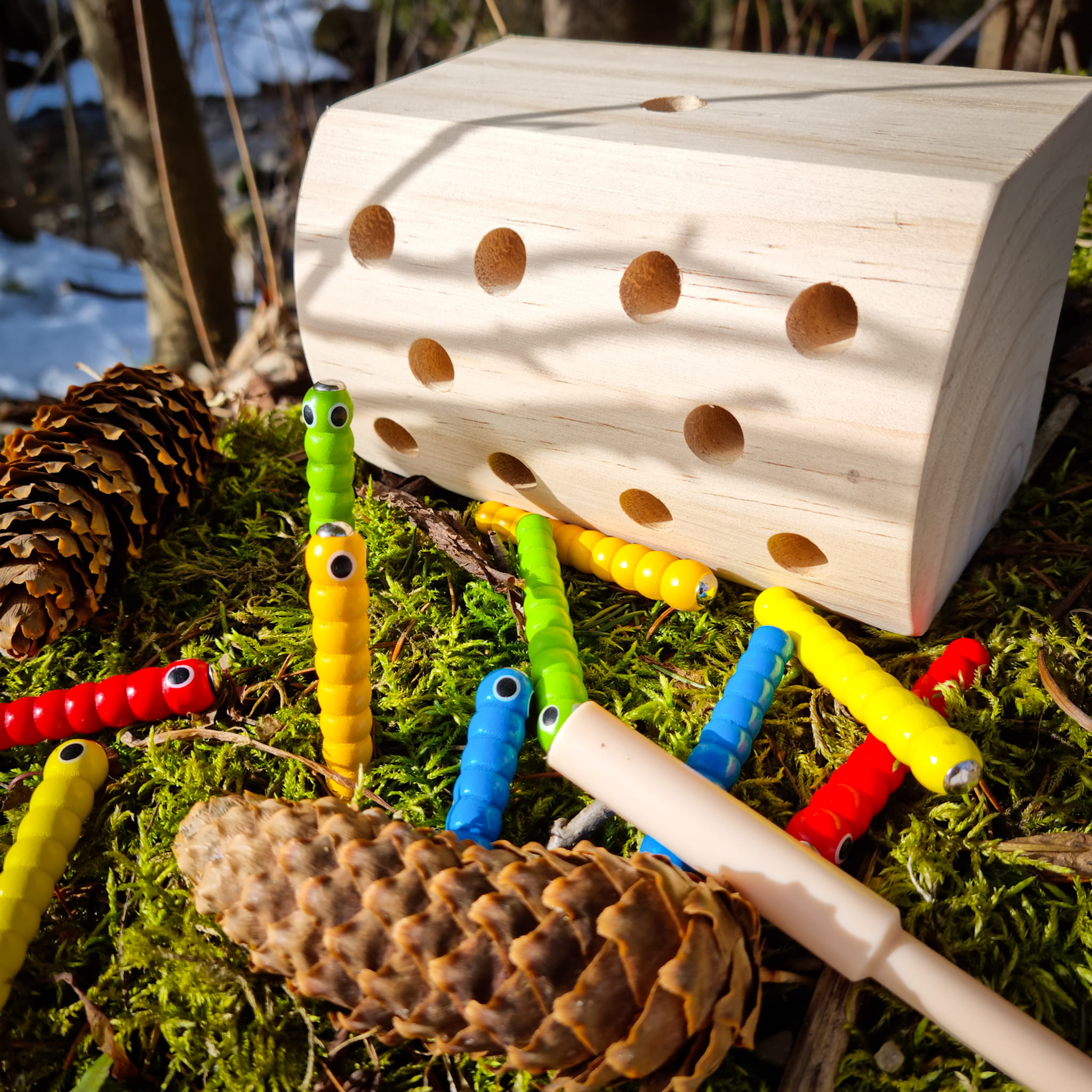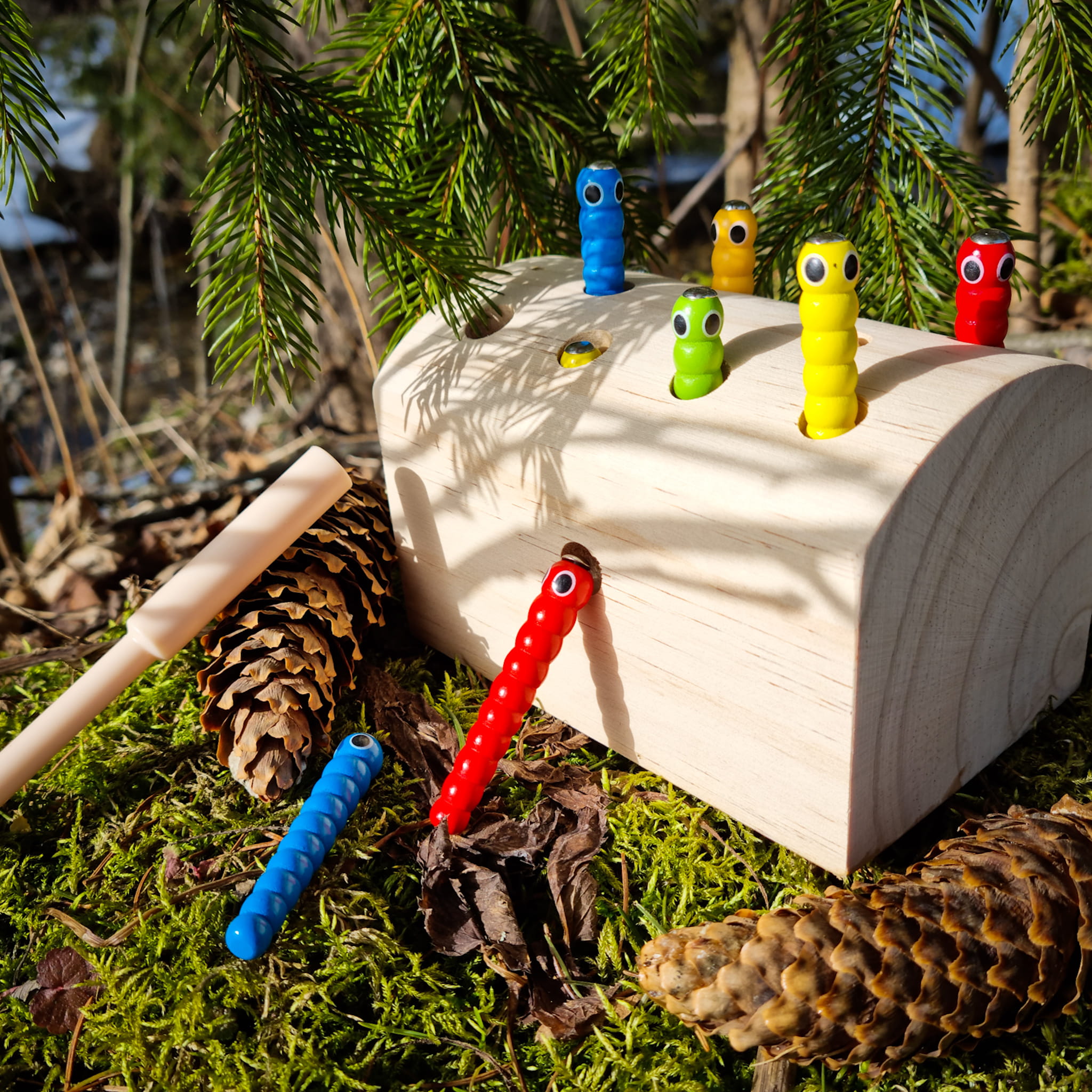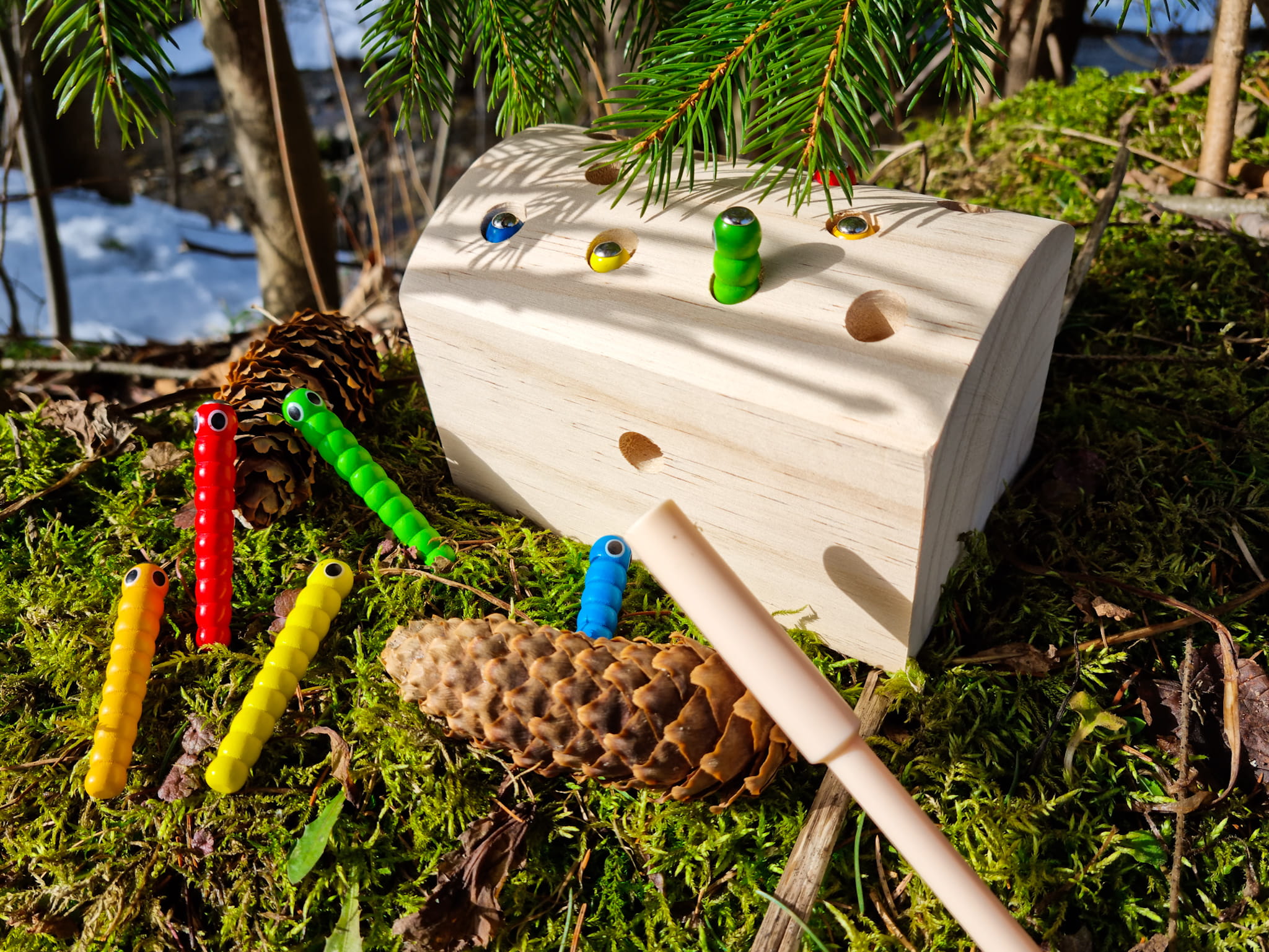 Zabawa polega na wyciągnięciu z drewna schowanych korników za pomocą zakończonej magnesem pałeczki.