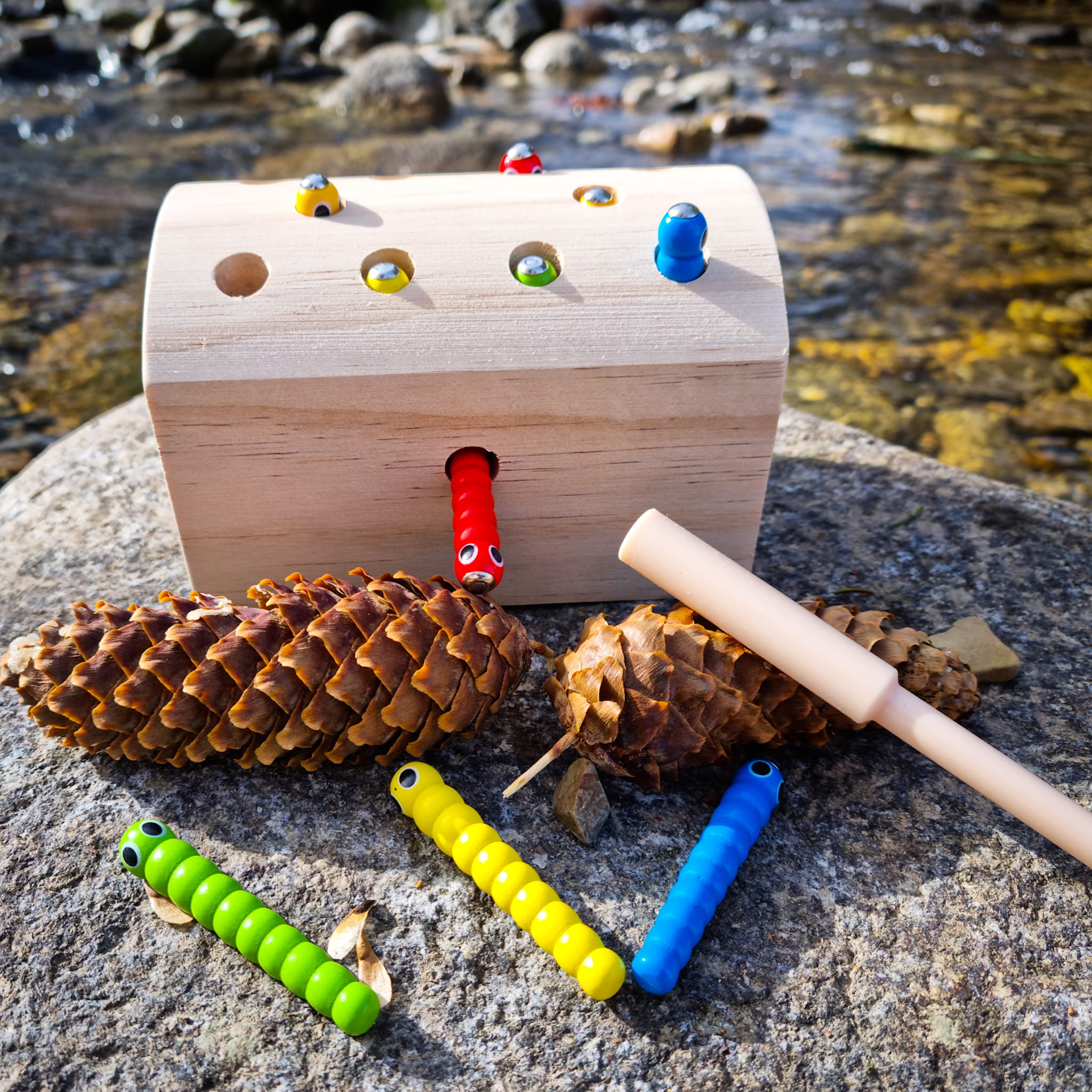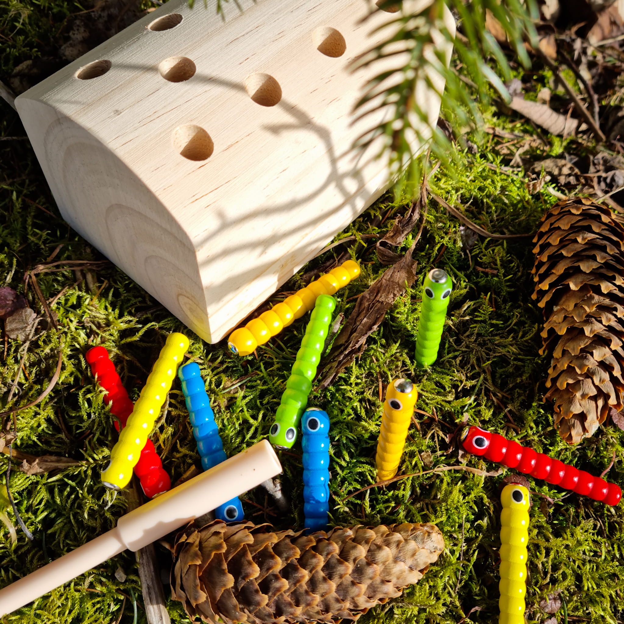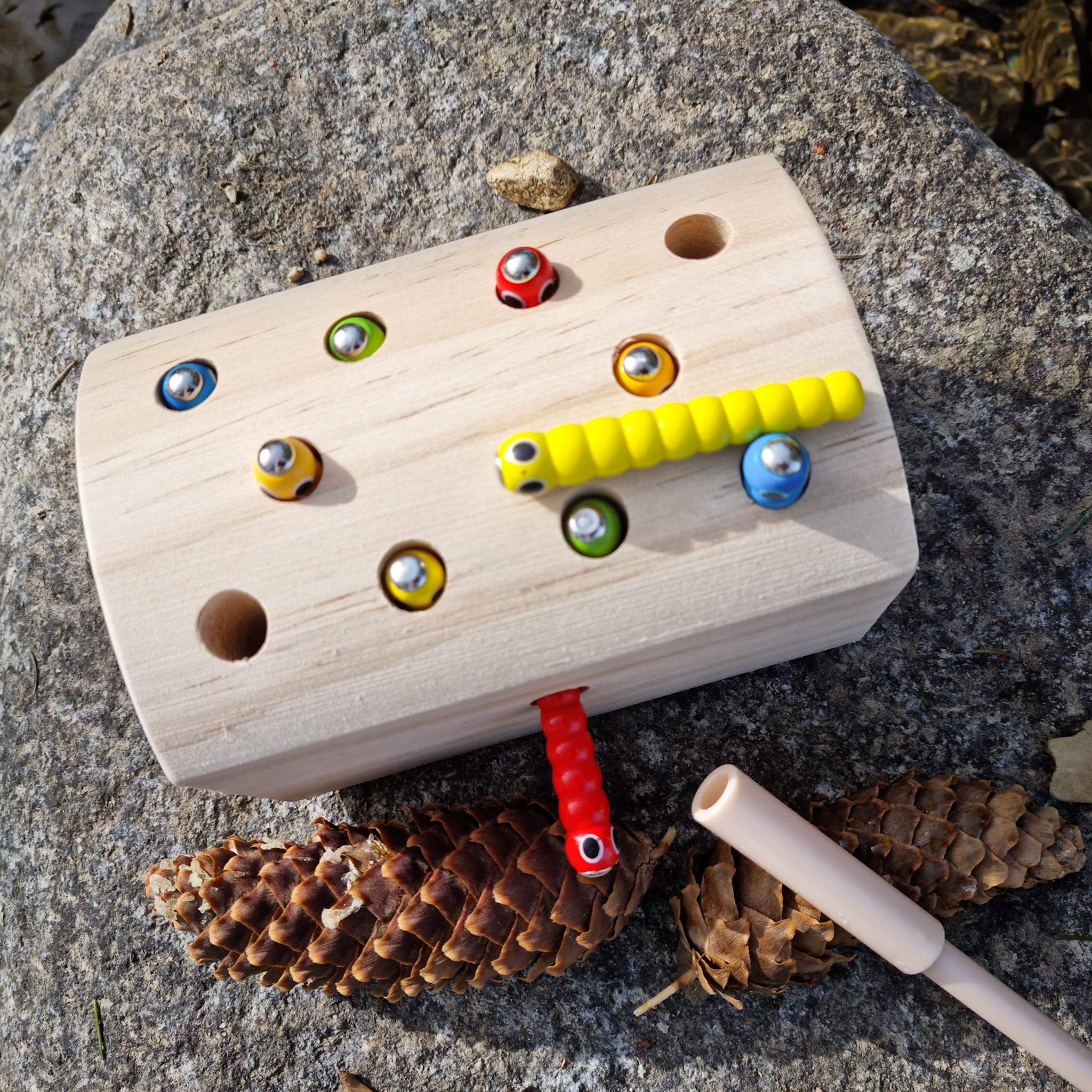 Zabawa polega na wyciągnięciu z drewna schowanych korników za pomocą zakończonej magnesem pałeczki.