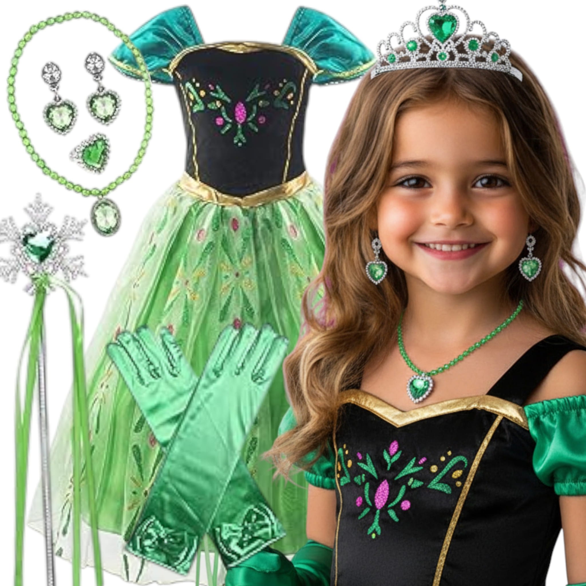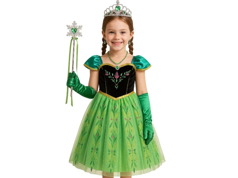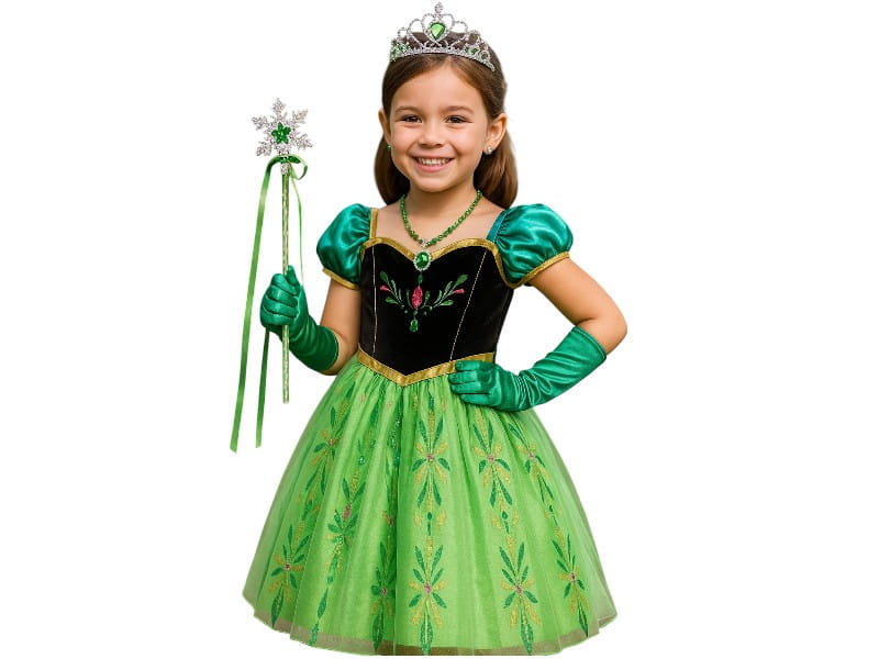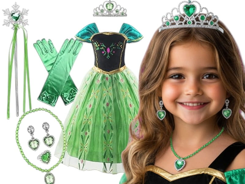 Do stroju dołączone są ważne dodatki. W komplecie znajdziesz biżuterię, która nadaje strojowi charakterystyczny wygląd Anny. Dodatkowo berło, zielone rękawiczki oraz korona dodadzą całości niepowtarzalny urok.