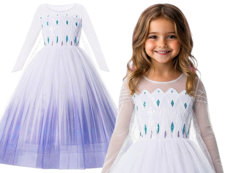 Suknia doskonale oddaje wygląd Elzy z filmu Frozen II. Sukienka pięknie wykonana z długimi rękawami z siateczkami, które delikatnie oplatają ręce. Na przodzie błyszczące zdobienia przypominające diamenciki. Sukienka wykonana z przyjemnych w dotyku materiałów, gwarantuje wygodę noszenia i swobodę ruchów podczas wszelkich zabaw, występów czy przyjęć kostiumowych.