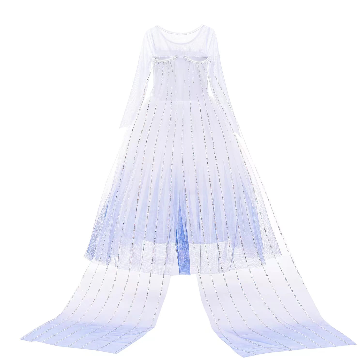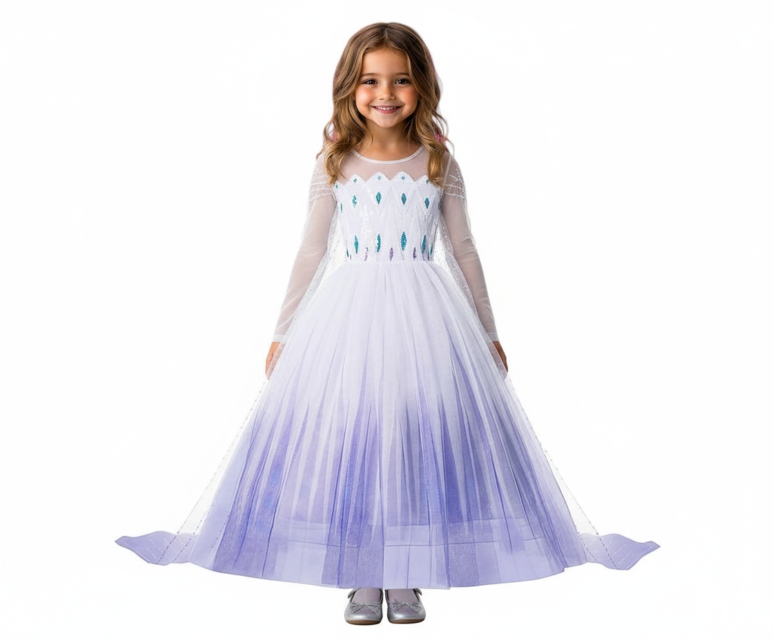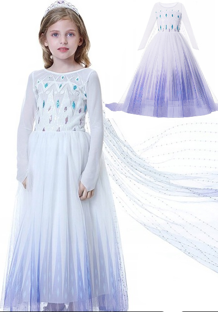 Suknia, stanowiąca serce tego stroju, doskonale oddaje wygląd Elzy z filmu. Sukienka pięknie wykonana z długimi rękawami z siateczkami, które delikatnie oplatają ręce. Na przodzie błyszczące zdobienia przypominające diamenciki. Sukienka wykonana z przyjemnych w dotyku materiałów, gwarantuje wygodę noszenia i swobodę ruchów podczas wszelkich zabaw, występów czy przyjęć kostiumowych.