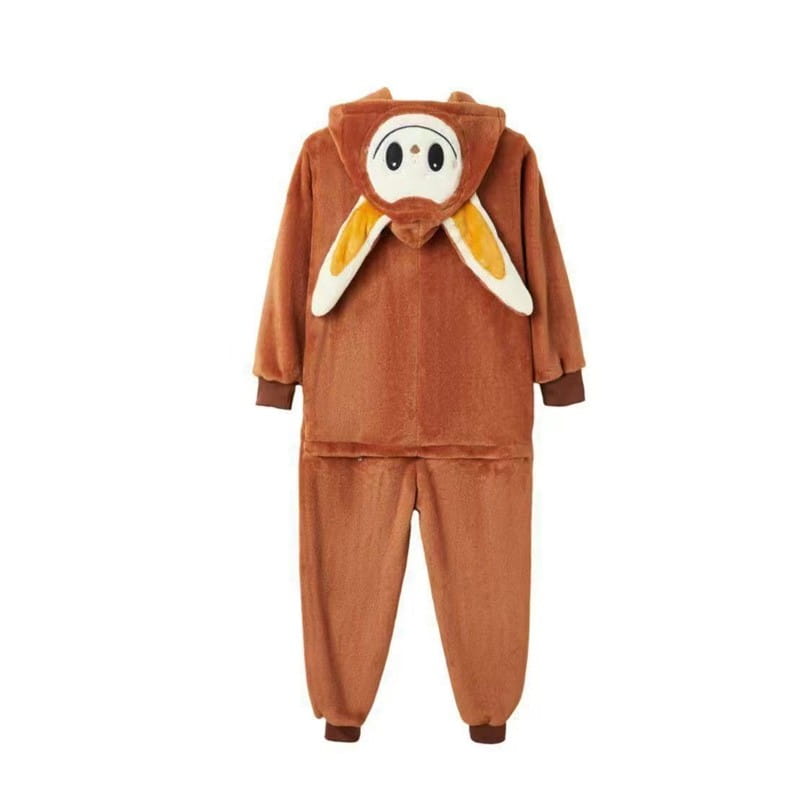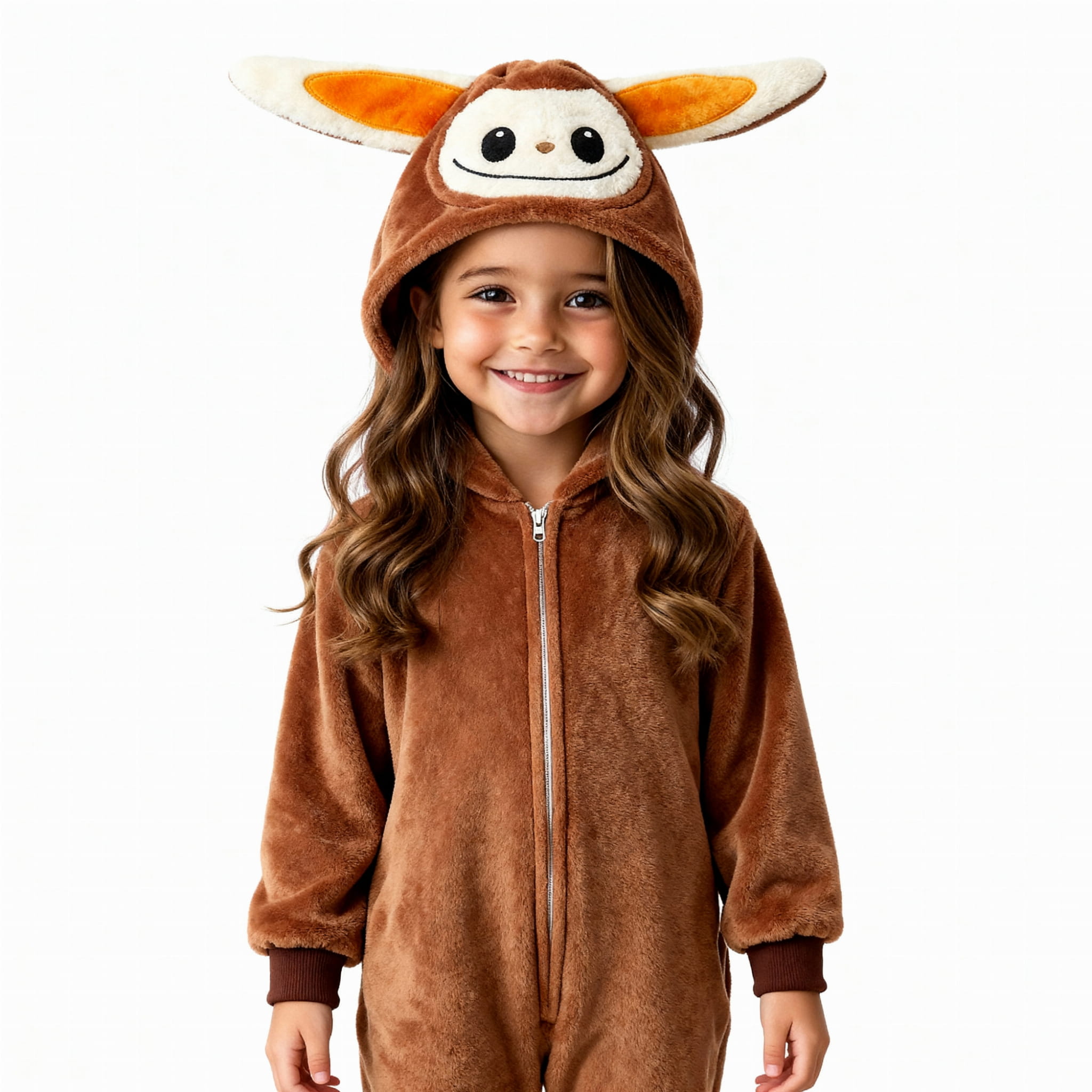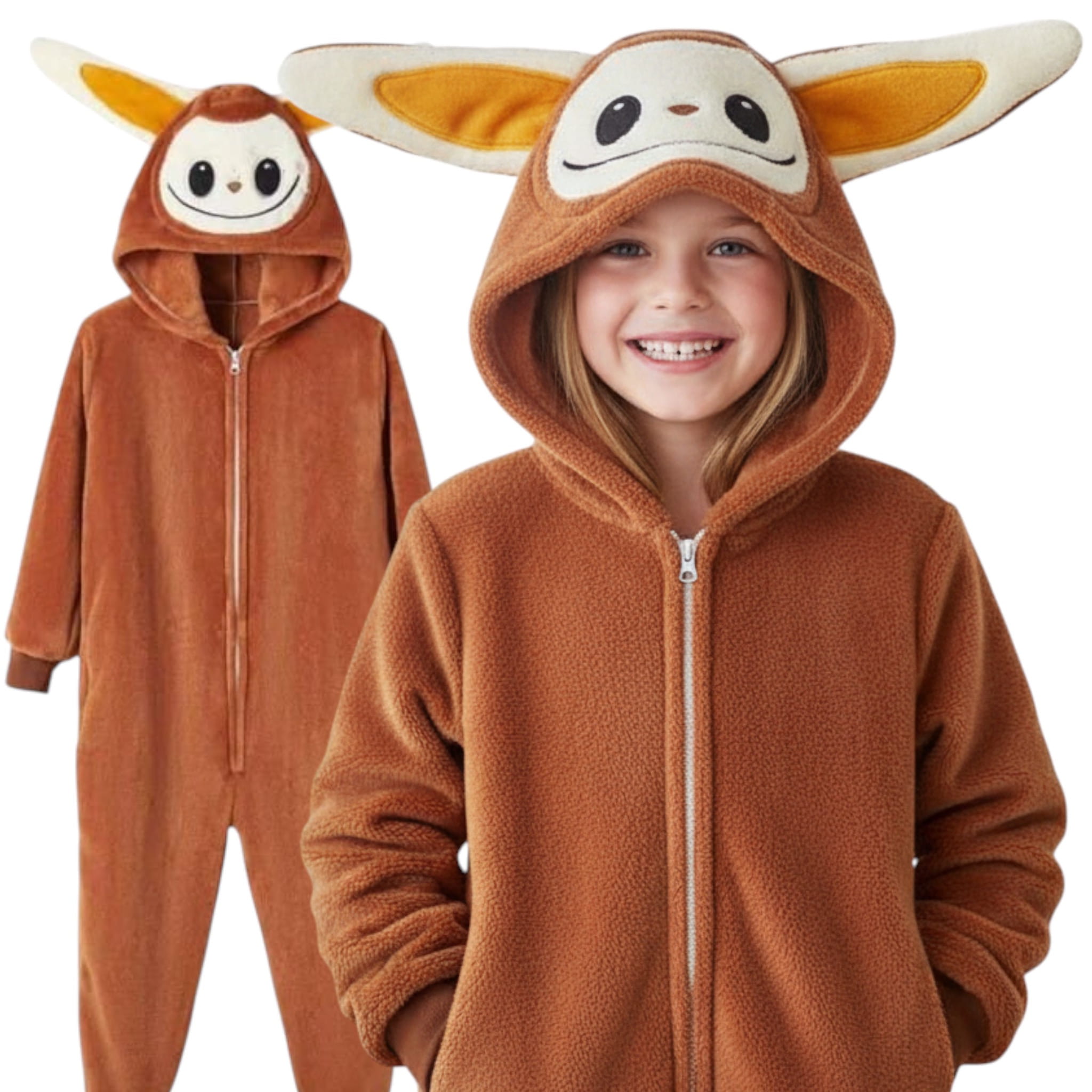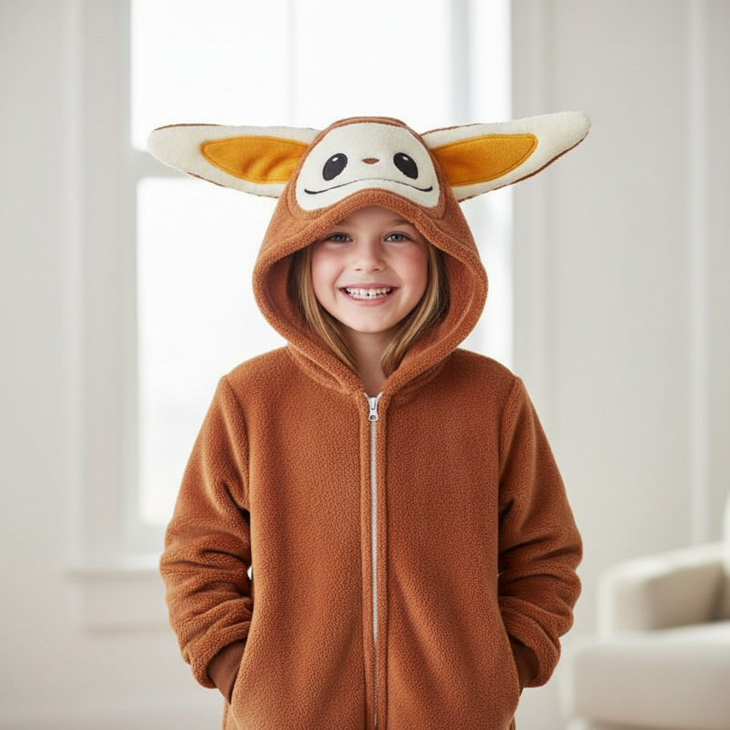 Piżamka została wykonana z wyjątkowo miękkiego, przyjemnego w dotyku materiału, który otula jak mięciutki kocyk. Całość utrzymana jest w pięknym, głębokim odcieniu bązu, a największym hitem jest duży kaptur z wesołą buźką Labubu i charakterystycznymi, długimi uszkami. To połączenie, obok którego nie można przejść obojętnie!
