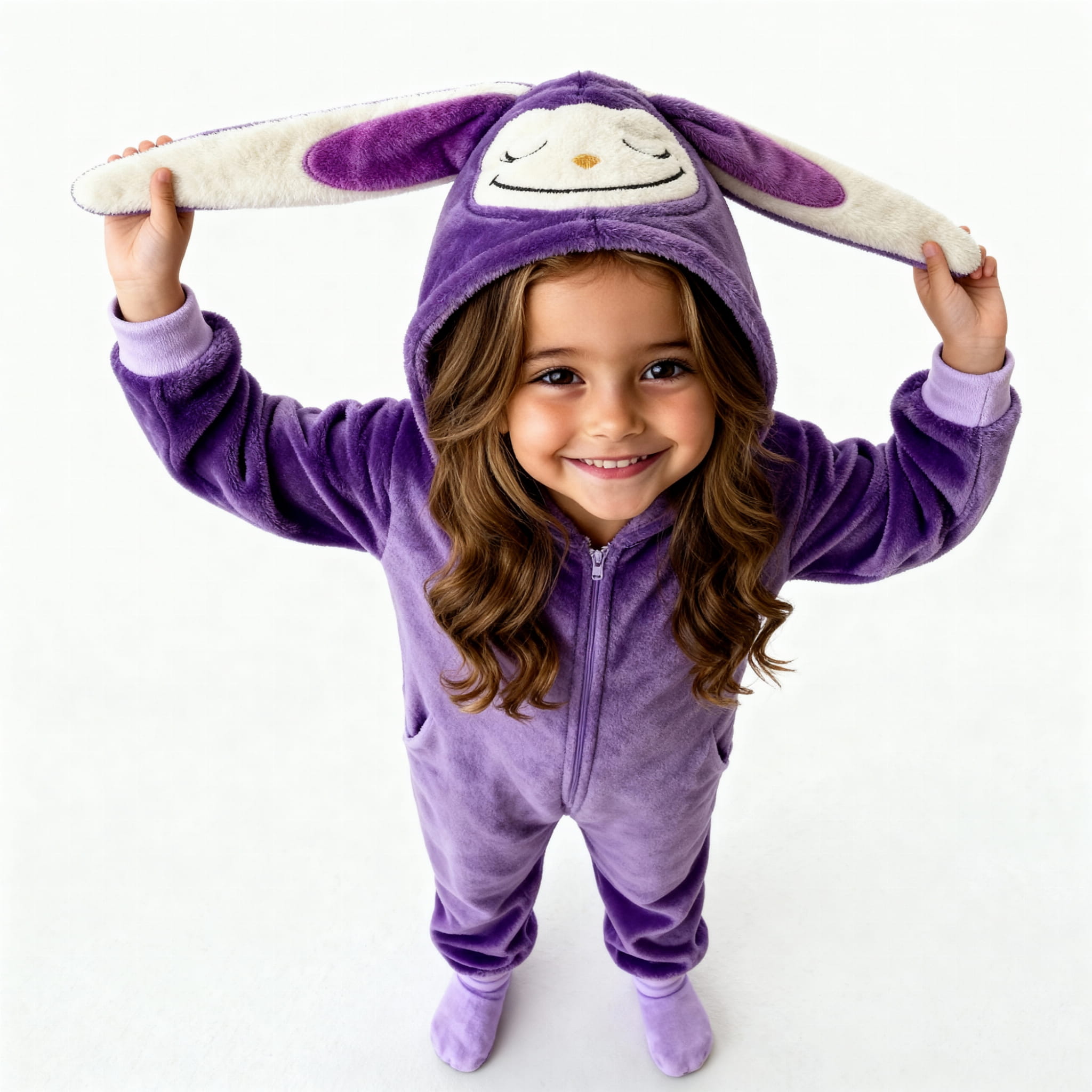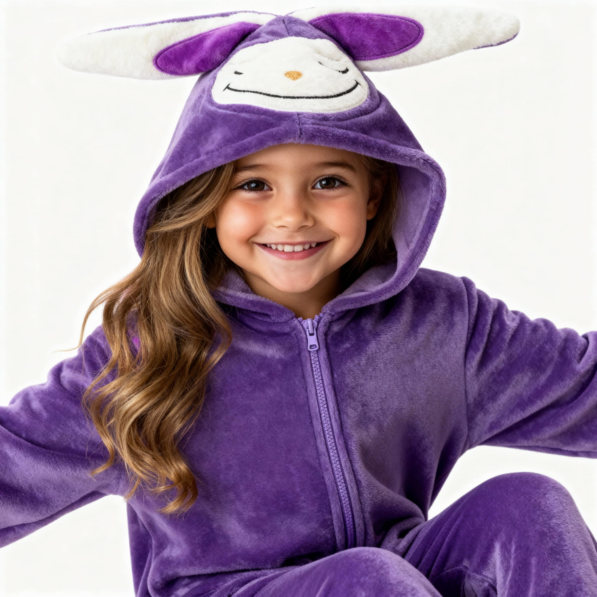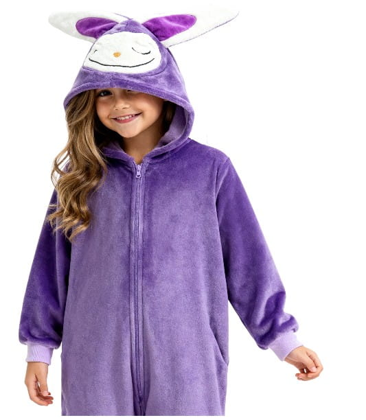 Piżamka została wykonana z wyjątkowo miękkiego, przyjemnego w dotyku materiału, który otula jak mięciutki kocyk. Całość utrzymana jest w pięknym, głębokim odcieniu fioletu, a największym hitem jest duży kaptur z wesołą buźką Labubu i charakterystycznymi, długimi uszkami. To połączenie, obok którego nie można przejść obojętnie!