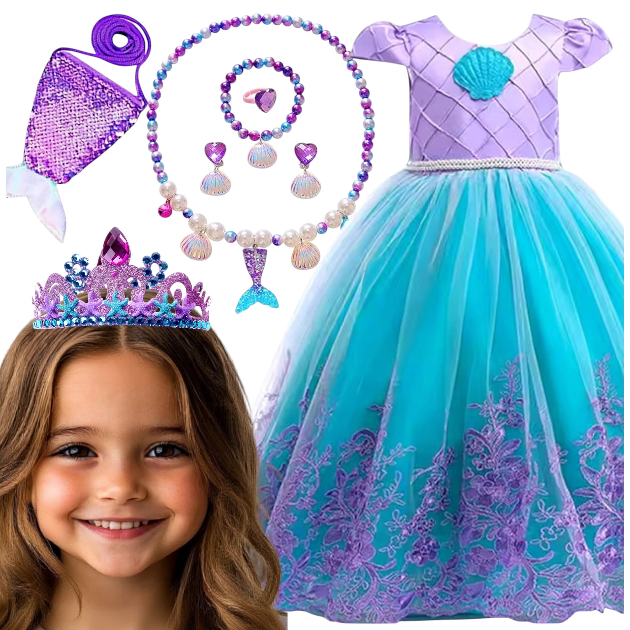 Strój zawiera piękną sukienkę w odcieniach błękitu i fioletu, która odwzorowuje charakterystyczny wygląd syrenki.