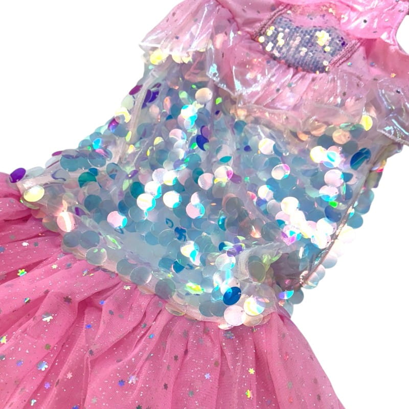 Sukienkę syrenki – różowo-niebieską z błyszczącymi cekinami i tiulem