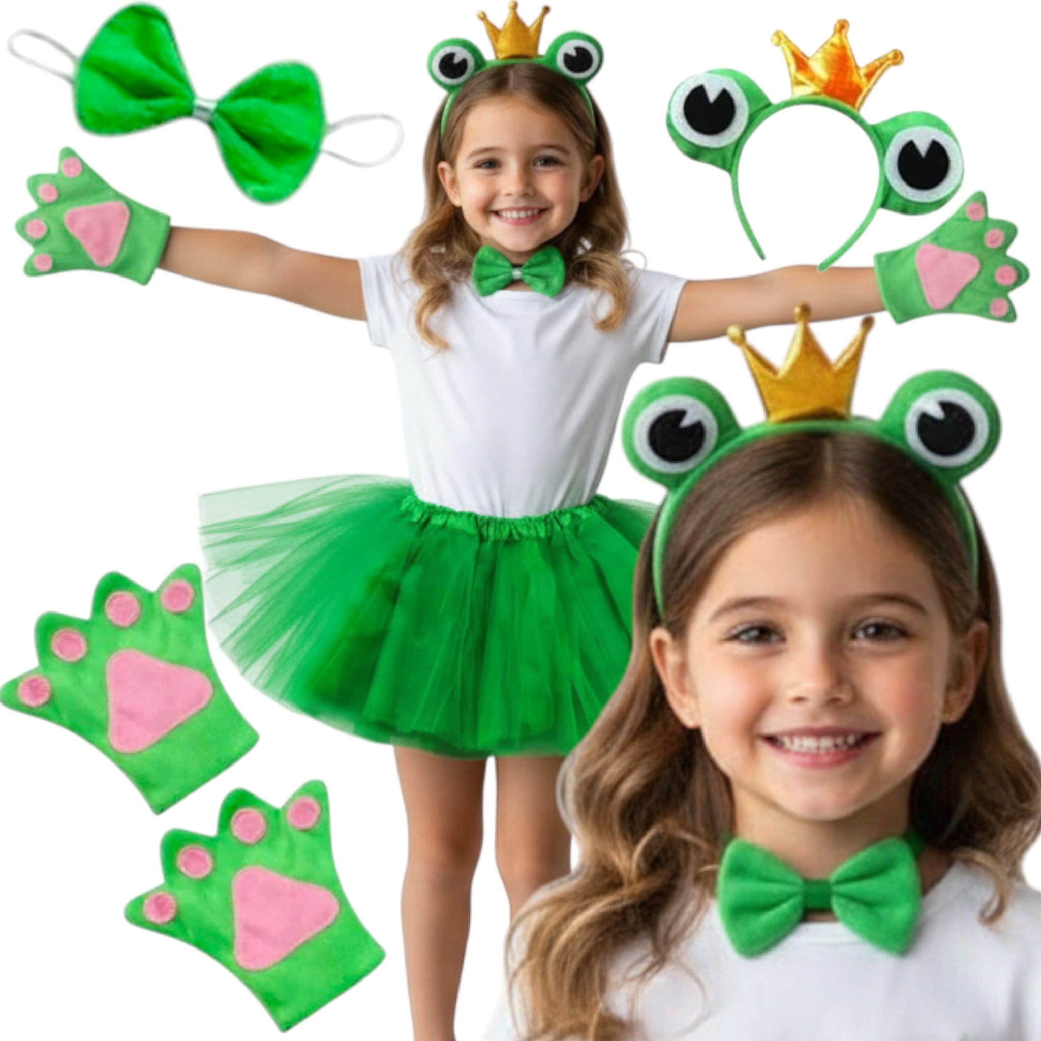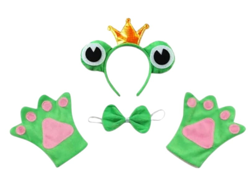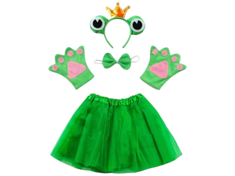 W skład zestawu wchodzi zielona, tiulowa spódniczka, która pięknie się układa i dodaje lekkości całej stylizacji. Dopełnieniem stroju są miękkie rękawiczki w kształcie żabich łapek z różowymi detalami, opaska z dużymi oczkami i złotą koroną oraz urocza zielona muszka zakładana na szyję.