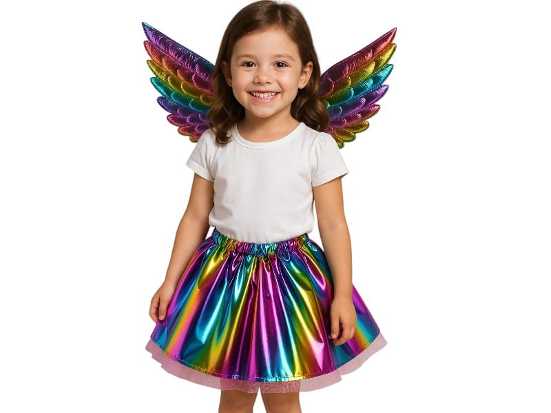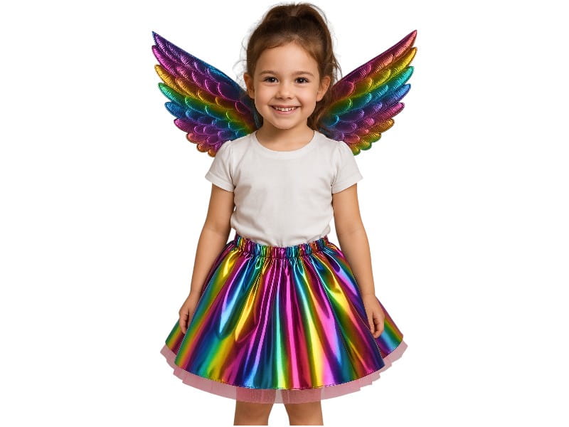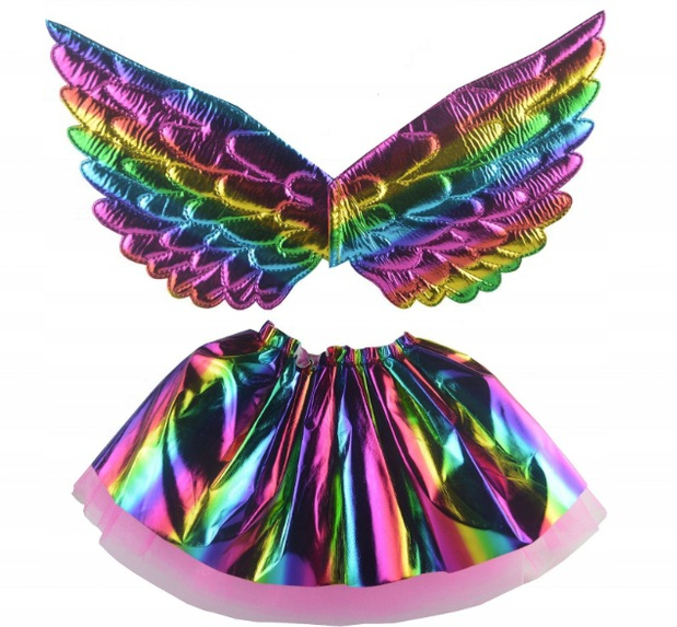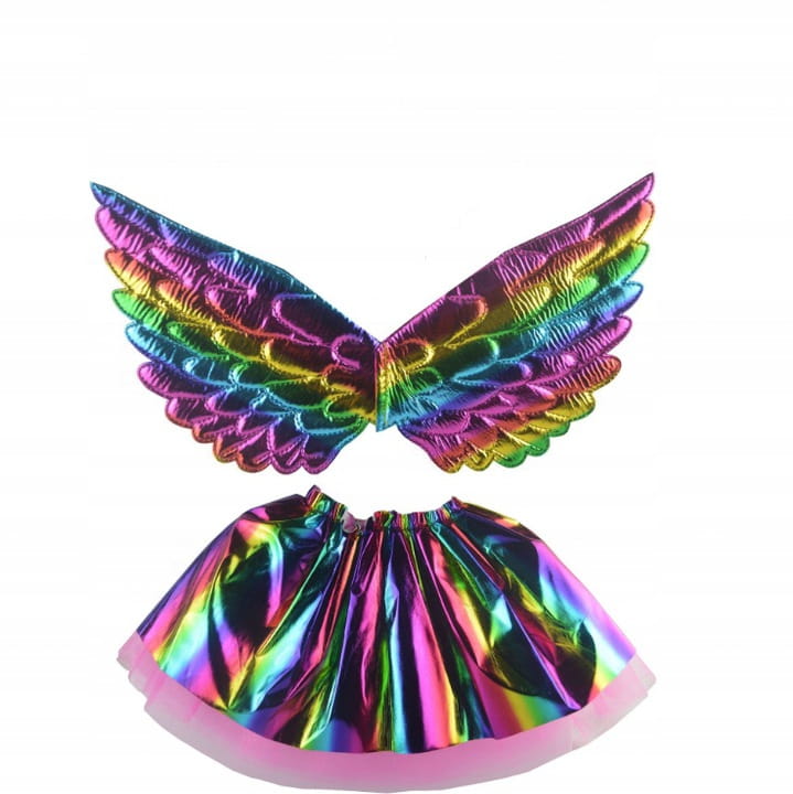 Zestaw składa się z tęczowej spódniczki oraz ze skrzydeł, w tęczowych kolorach.